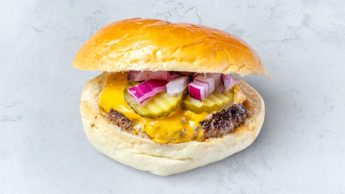 mit 100 g Rindfleisch, Burgersoße, Senf, gegrillten Zwiebeln und Burgergurken