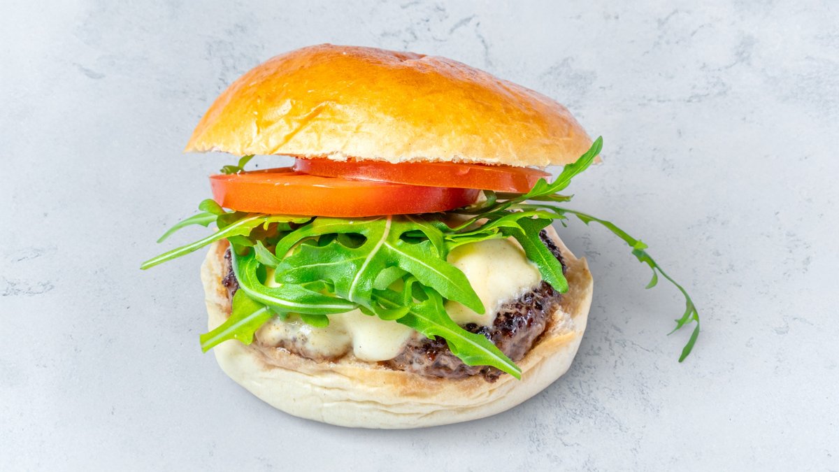 mit 150 g Rindfleischpatty, Burgersoße, Snackdressing, Rucola, geschmolzenem Mozzarella und Tomaten