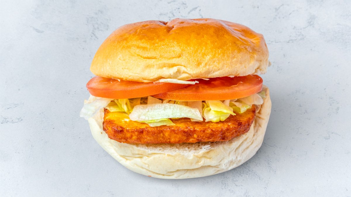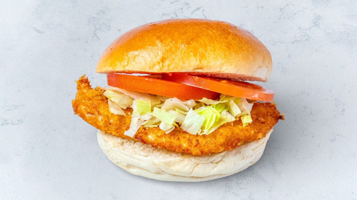 mit frittierter Hähnchenbrust, Burgersoße, Eisbergsalat und Tomaten