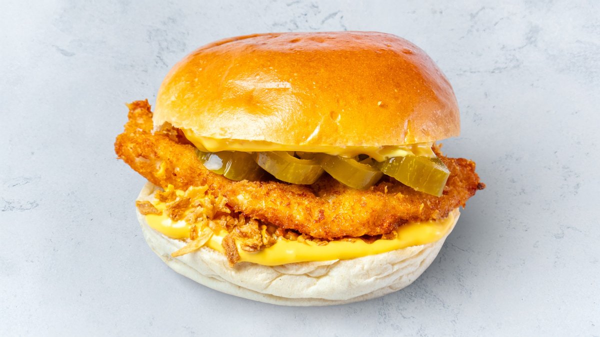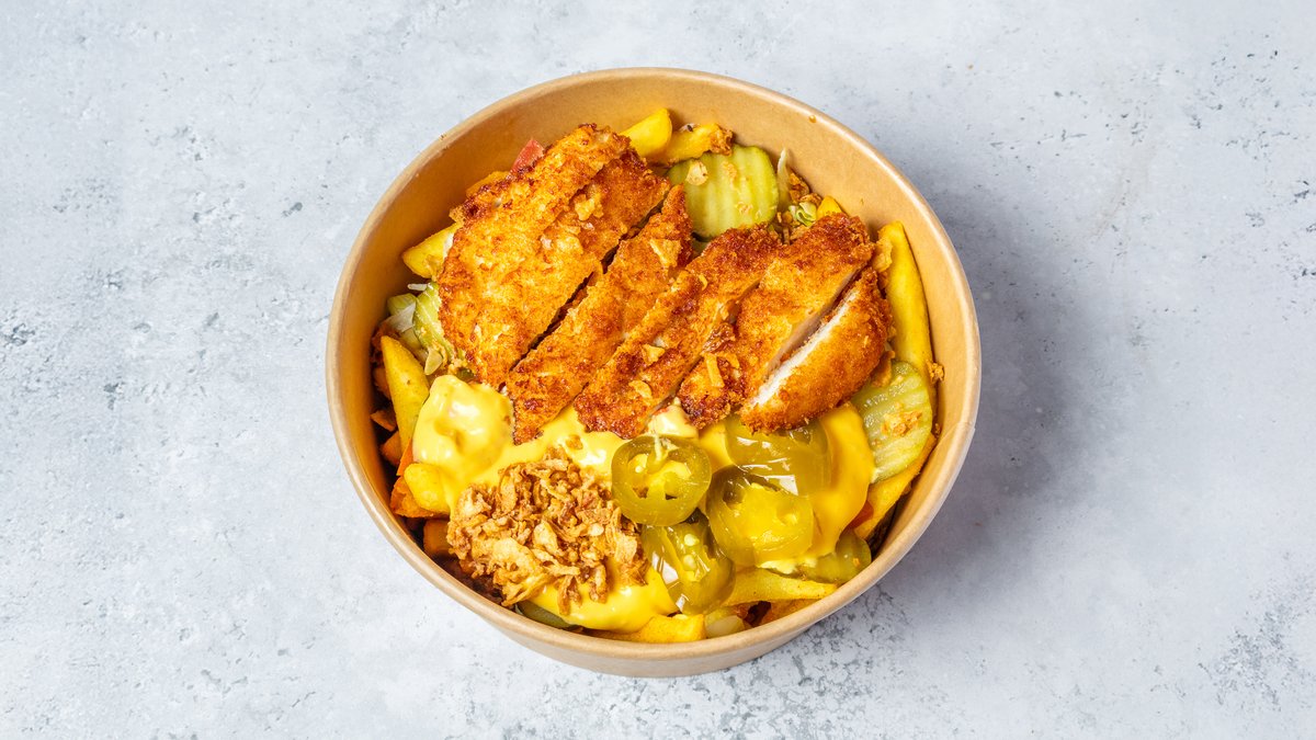 mit frittierter Hähnchenbrust, Chili-Cheese-Soße, Jalapeños und Röstzwiebeln