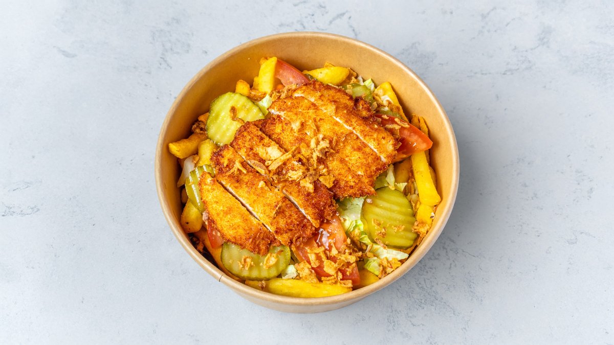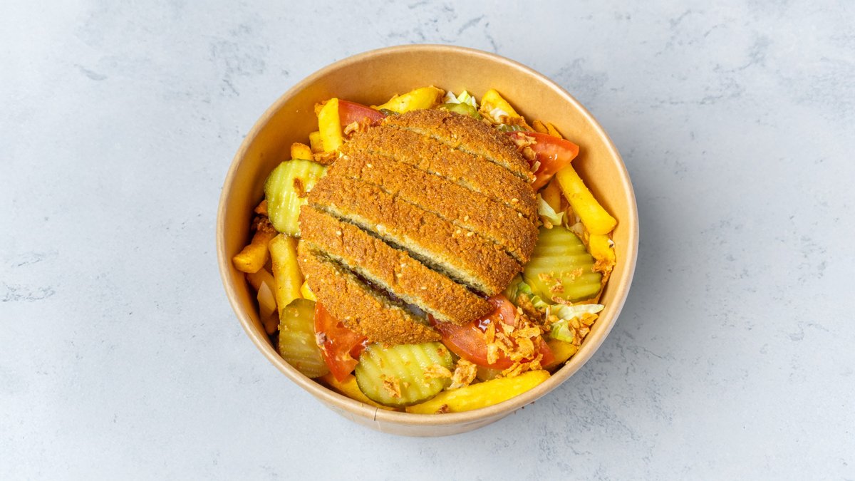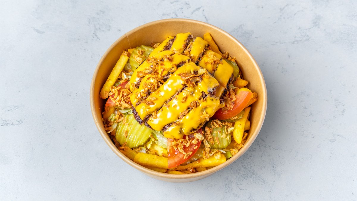 alle Bowls werden mit Pommes frites, Eisbergsalat, Burgergurken, Zwiebeln und Tomaten zubereitet