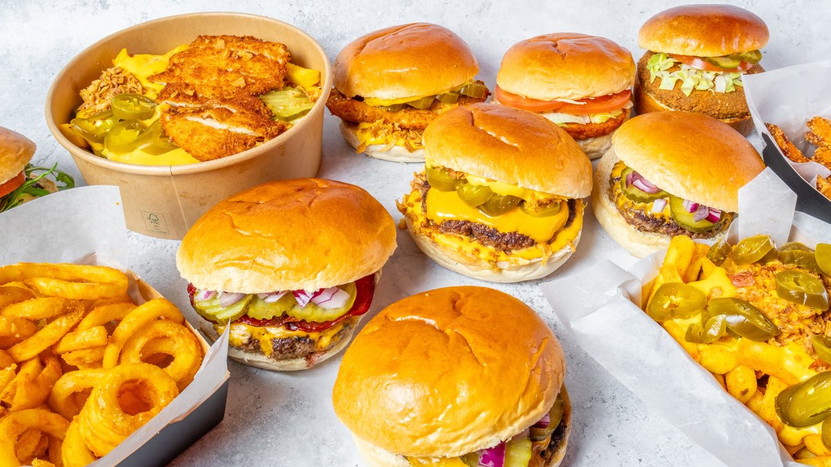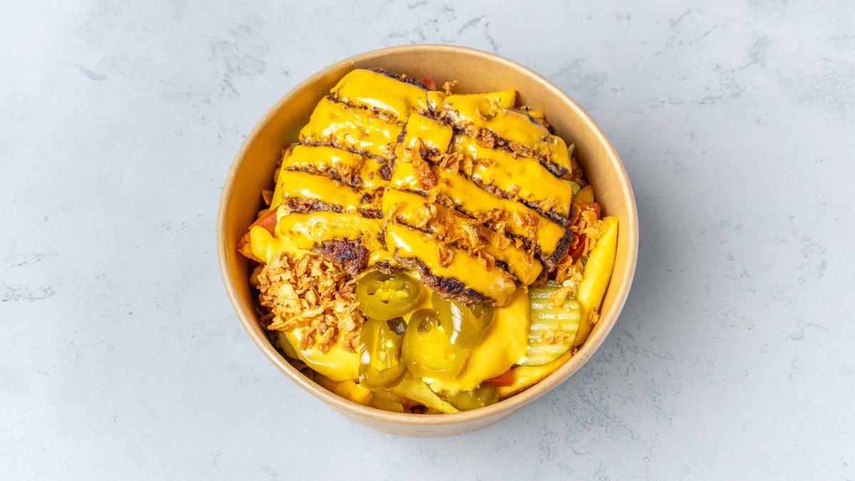 mit 2× 100 g Rindfleischpatties, Chili-Cheese-Soße, Jalapeños und Röstzwiebeln