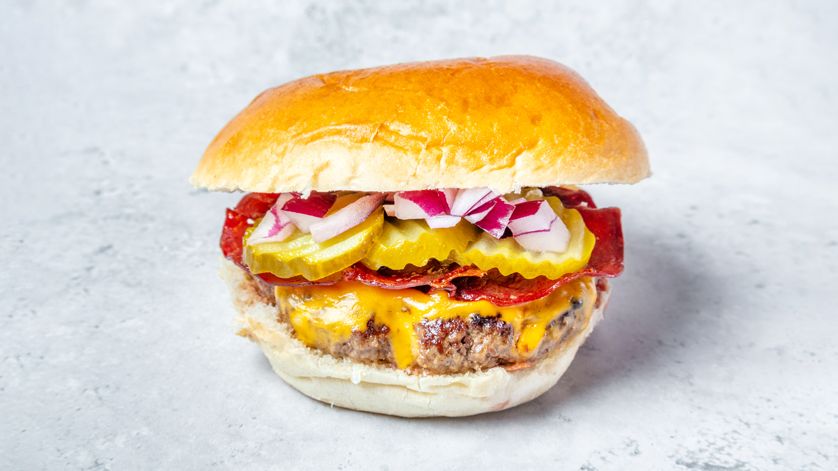 mit 150 g Rindfleischpatty, Burgersoße, Snackdressing, Käse, Pastrami, gegrillten Zwiebeln, Eisbergsalat und Tomaten