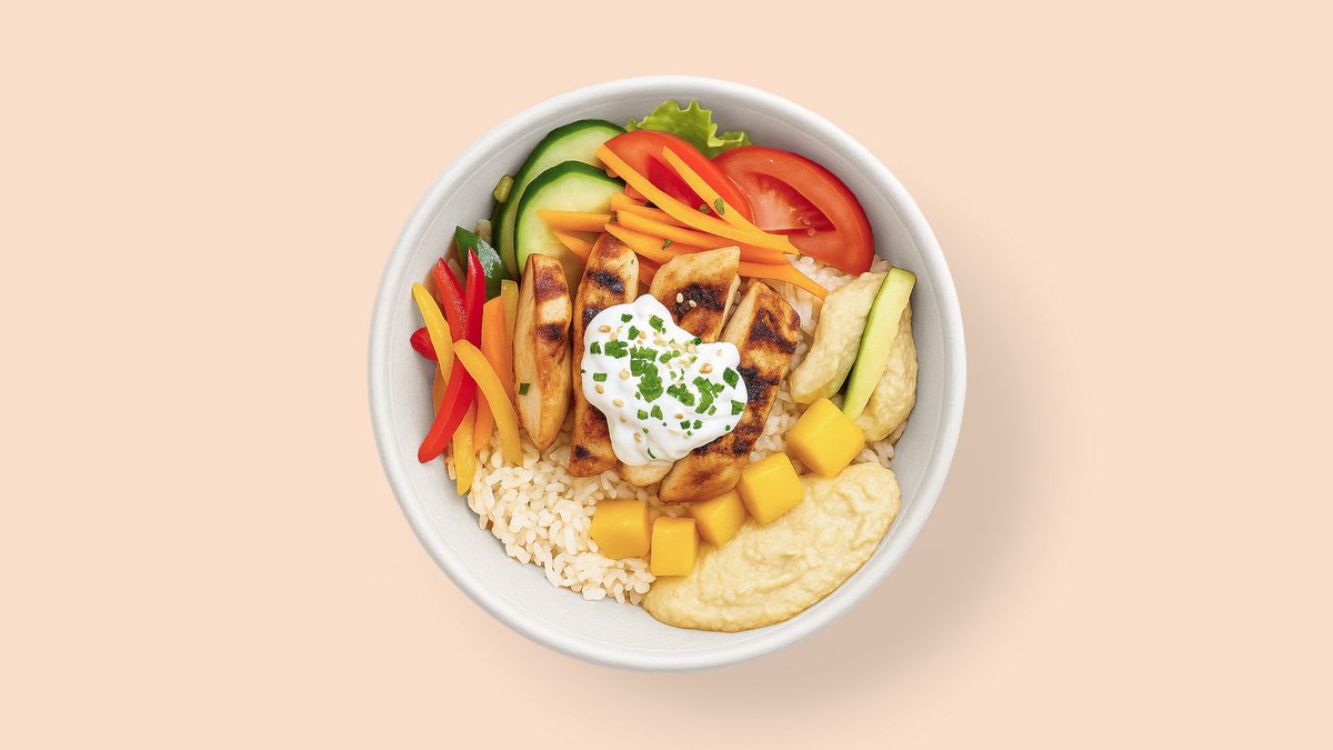 mit Hähnchen, Avocado, Mango, Paprika, Salat, Hummus und Sesamsoße