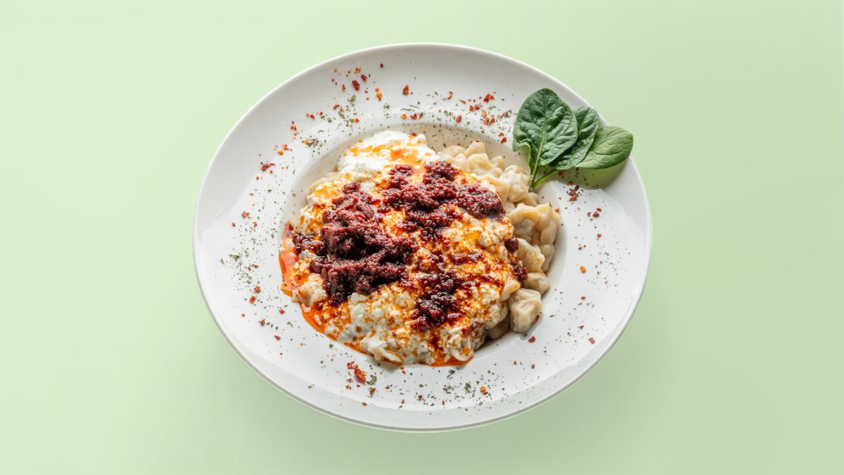 Hackfleischtaschen mit Joghurtsoße, Zwiebeln und Paprika
