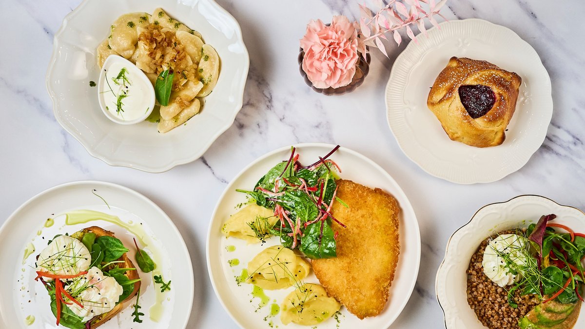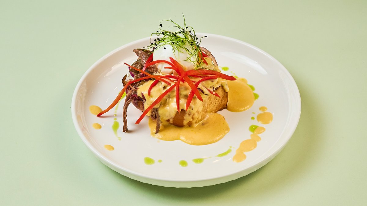 frisches Briochebrot mit Kalbfleisch, pochiertem Ei und Sauce hollandaise
