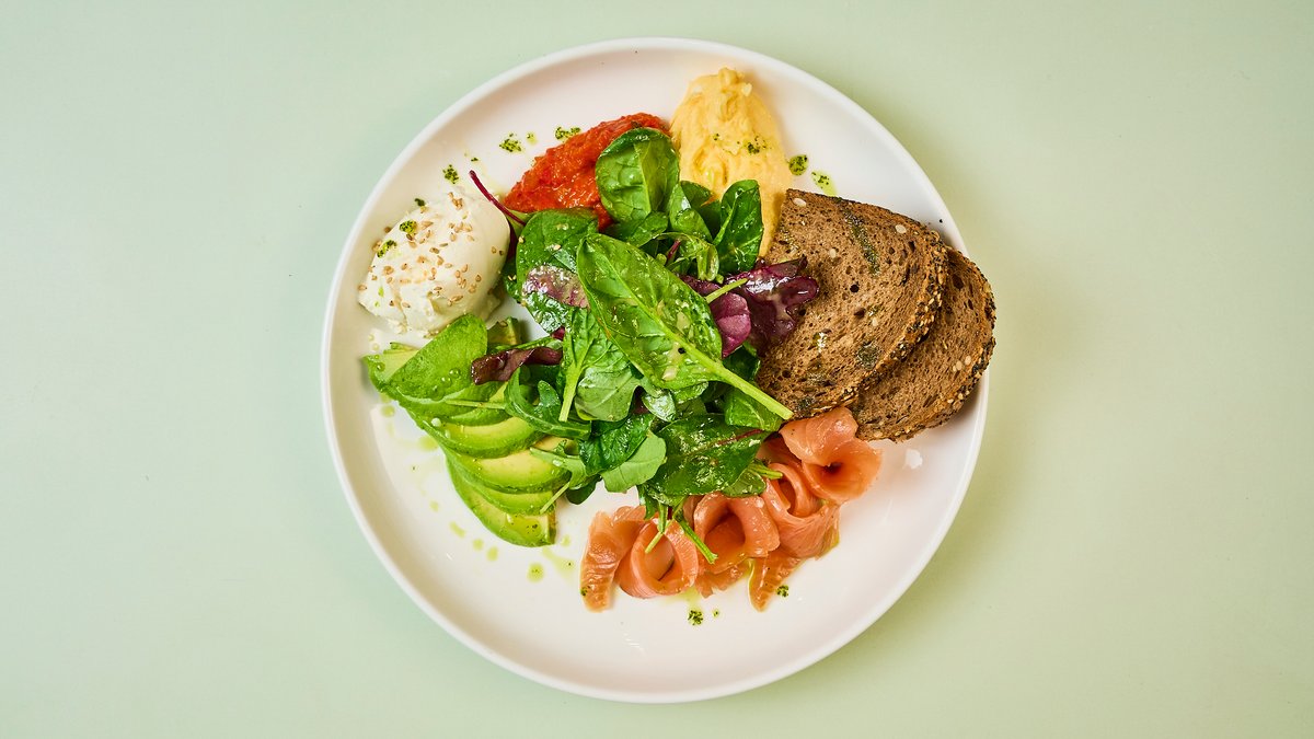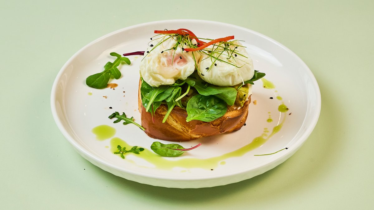 geröstetes Briochebrot mit frischer Avocado, pochiertem Ei und leichter Soße