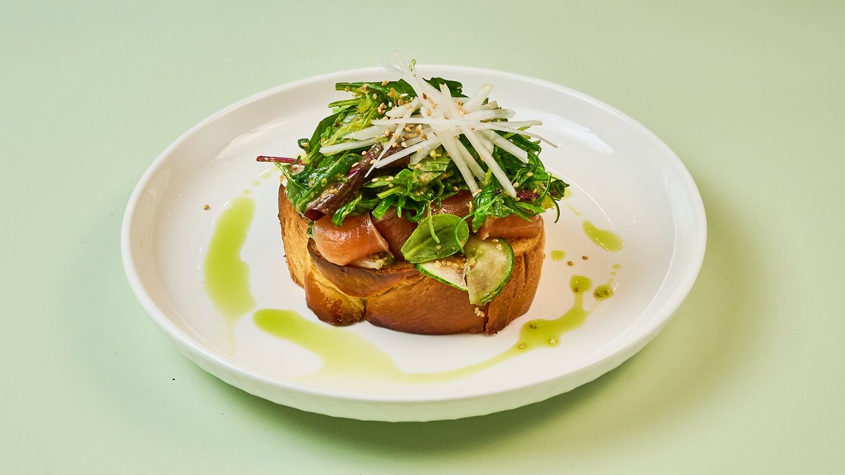 getoastetes Briochebrot mit hausgebeiztem Lachs, Chuka-Algen und Soße