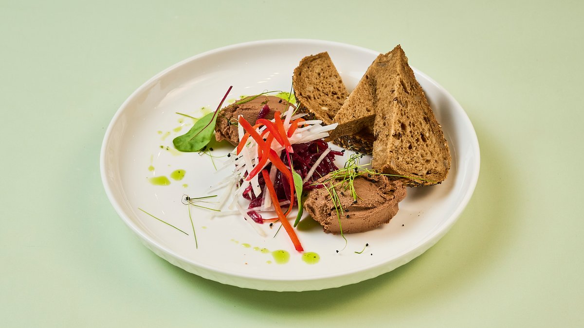 feine Hähnchenleberpastete, serviert mit Brot und Zwiebelkonfitüre