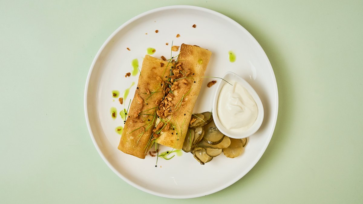hausgemachter Pfannkuchen mit Hähnchenfüllung und Sauerrahm