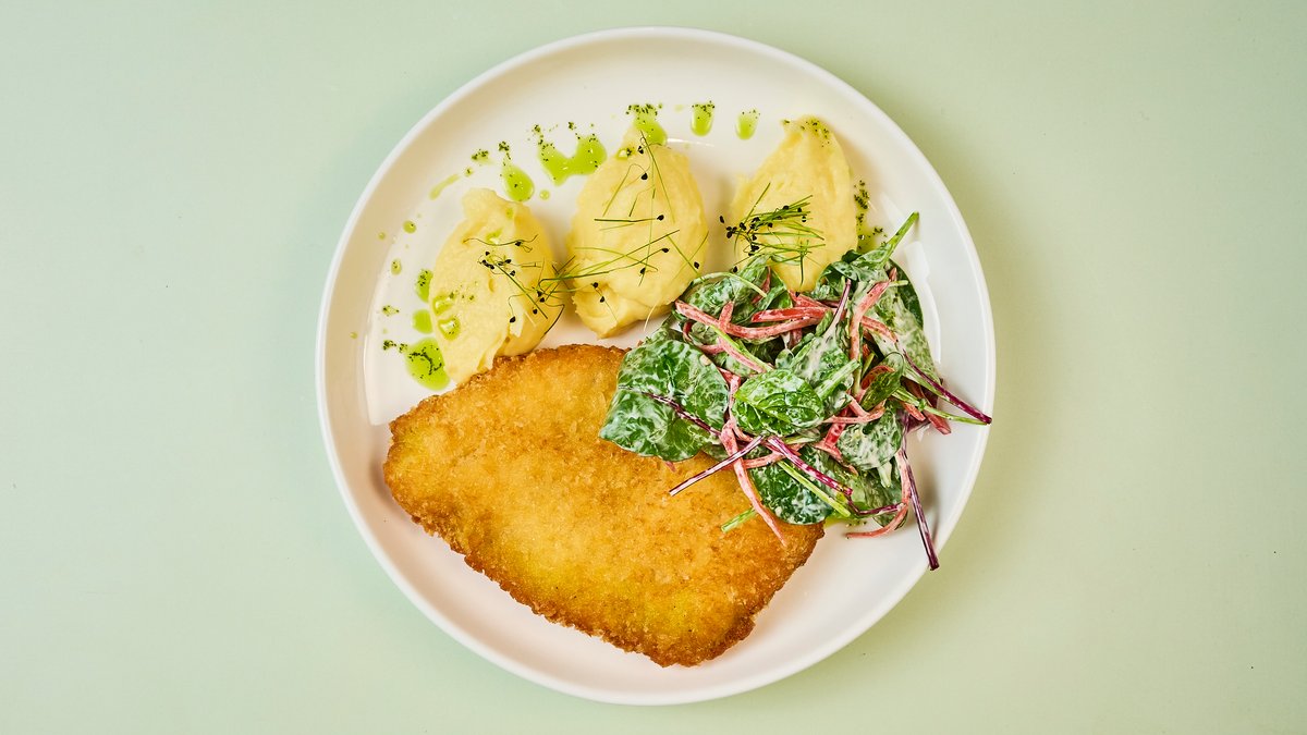 klassisches paniertes Schnitzel mit Kartoffelpüree und Beilagensalat