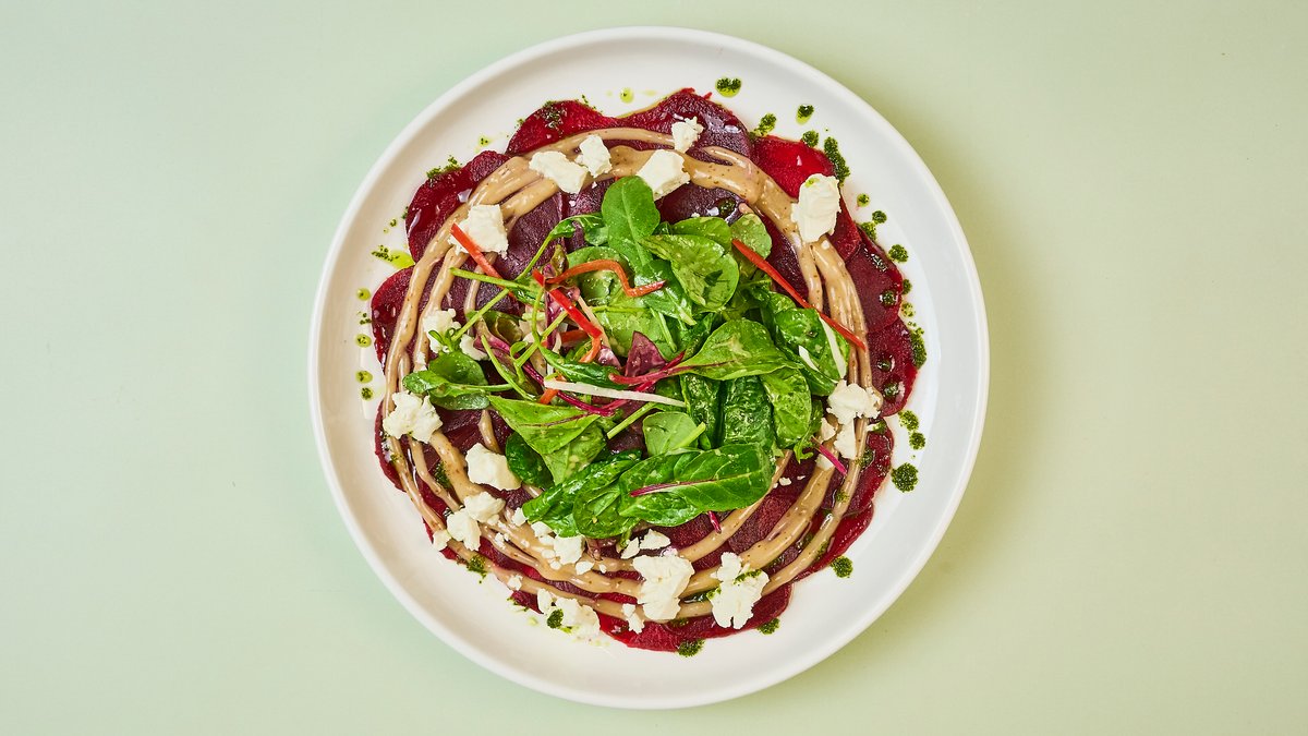 dünn geschnittene Rote Bete mit Feta und Rucola