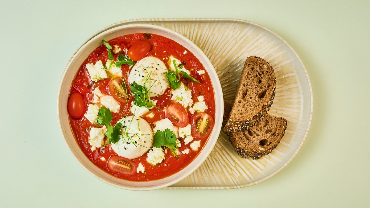 geschmorte Tomaten-Paprika-Soße mit pochierten Eiern und Feta