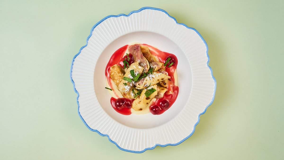 dünne Pfannkuchen mit süßer Kirschfüllung