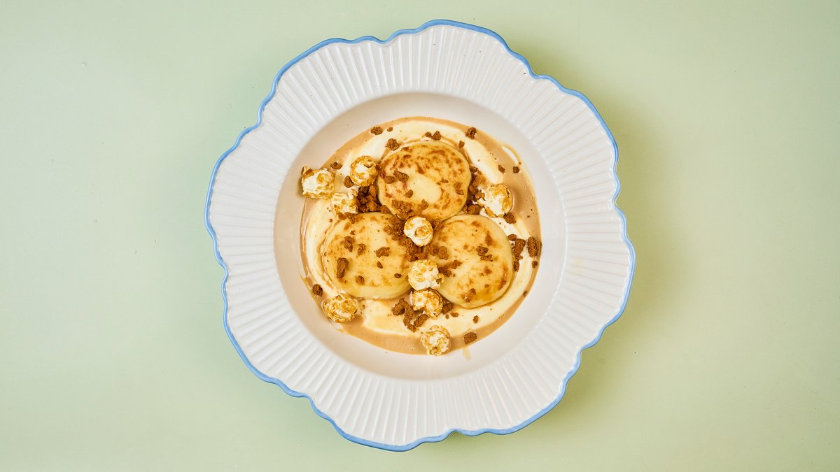 hausgemachte Quarkküchlein mit Schmand und Honig serviert