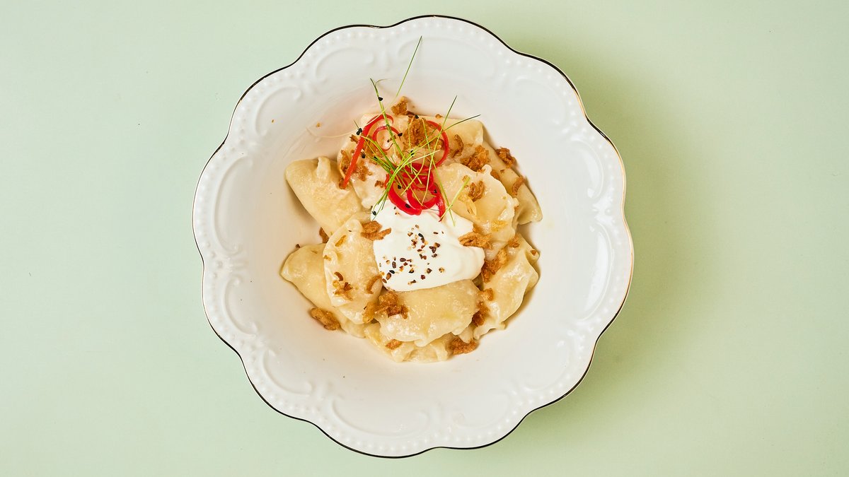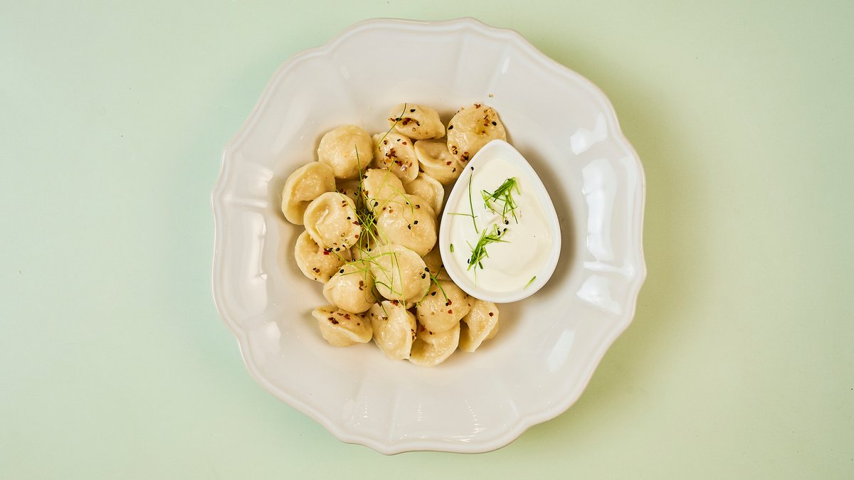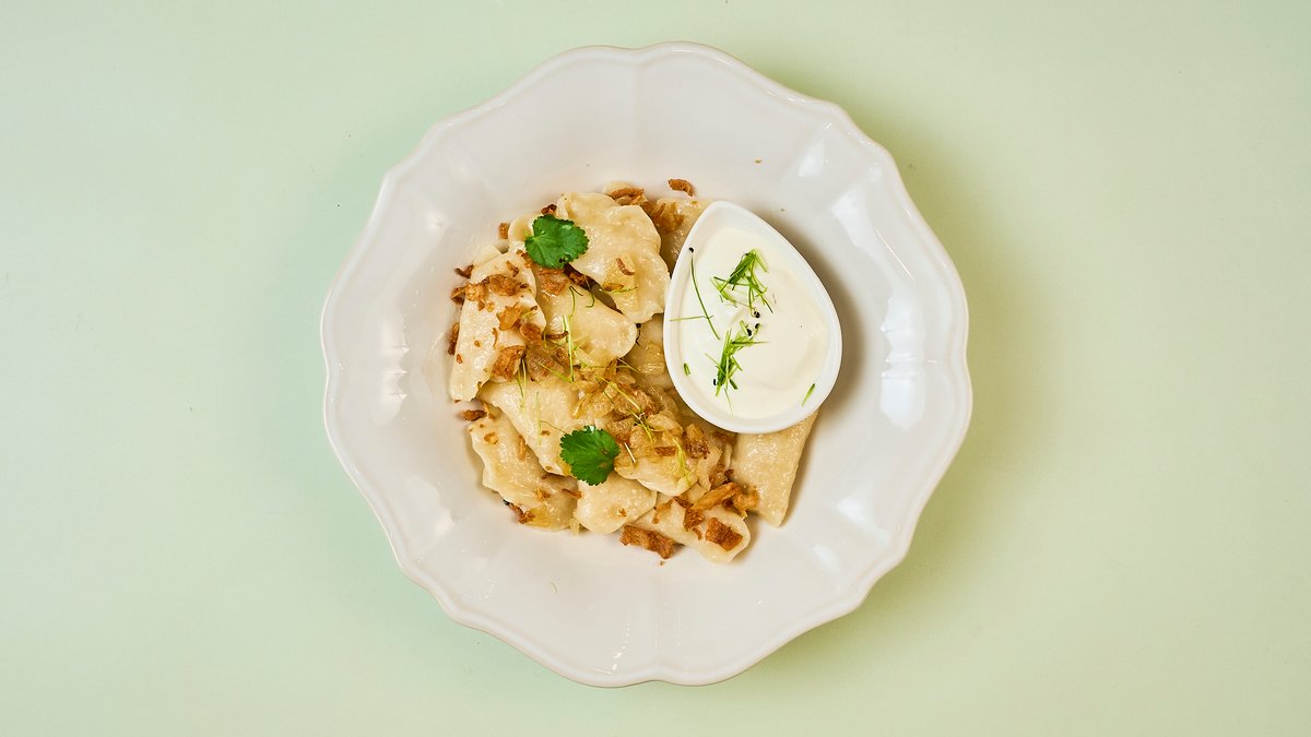 Teigtaschen mit Kartoffel-Zwiebel-Füllung, serviert mit Schmand