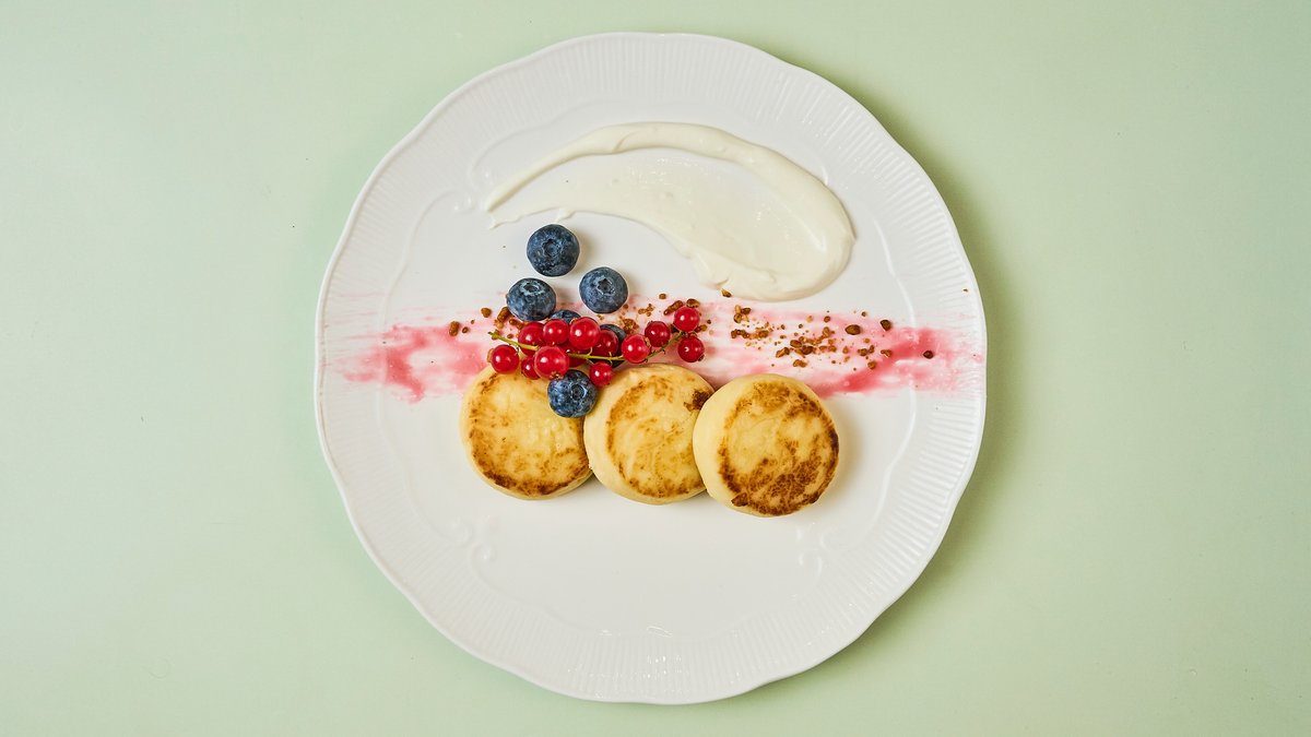 klassische russische Quarkküchlein aus drei Milchprodukten, serviert mit Früchten