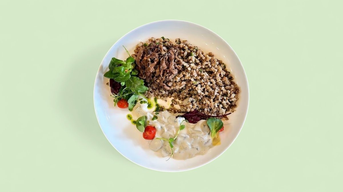 zartes Rindfleisch in cremiger Pilz-Sahne-Soße, serviert mit Buchweizen