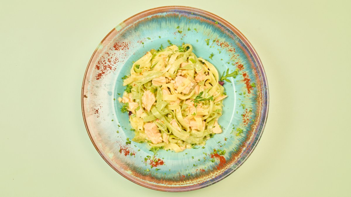 bunde Bandnudeln mit Rindfleisch, Lachsfiletstücken, Lauch und Pinienkernen in einer Sahnesoße nach kanadischer Art