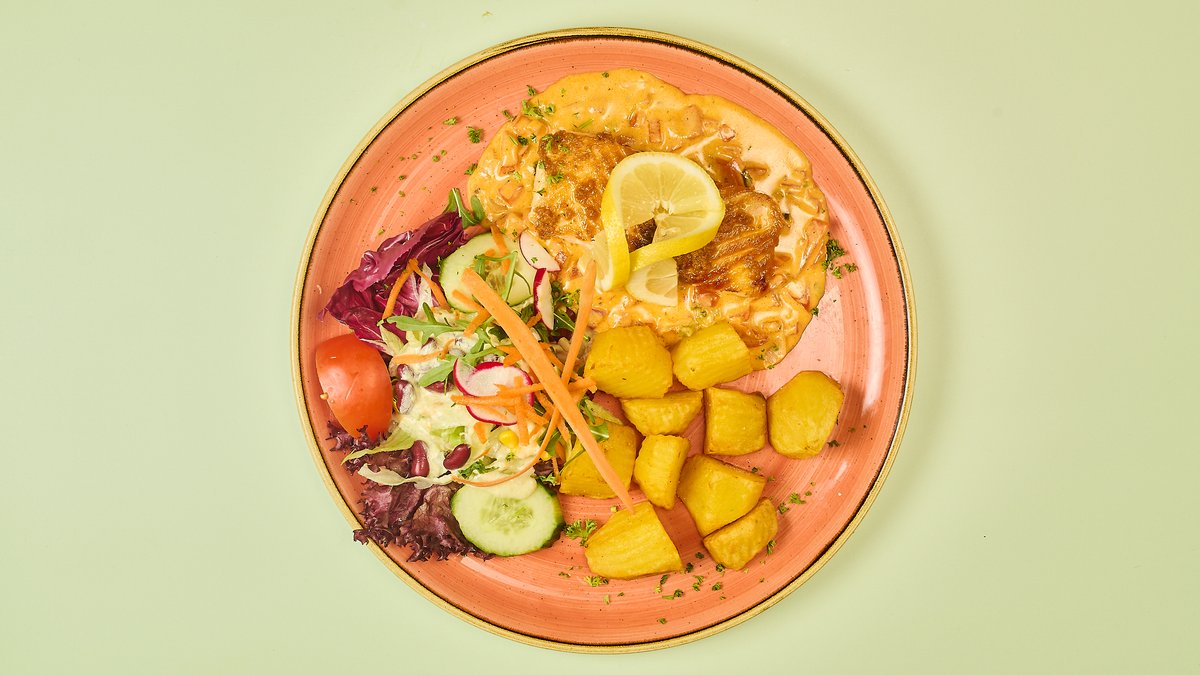 Schweinelachs Schnitzel mit Remouladensoße, Salatgarnitur und einer Beilage deiner Wahl