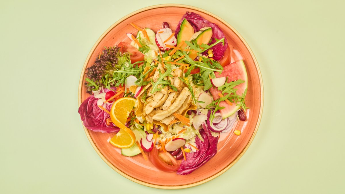 bunter Salat mit gegrillten Hähnchenbrustfiletstreifen, Avocado und exotischem Obst