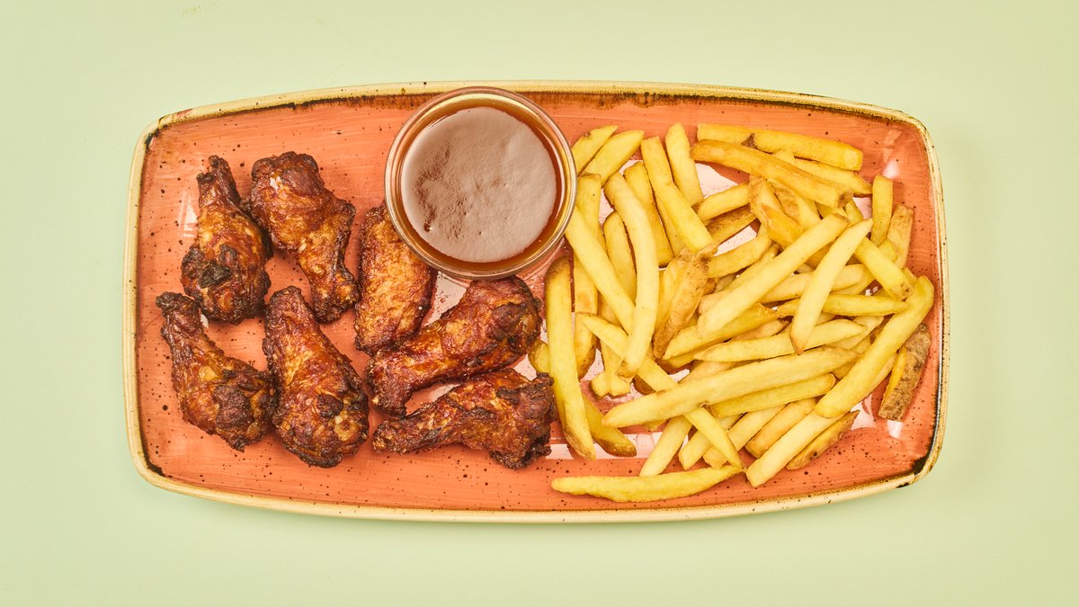 7x Hähnchenflügel nach Buffalo-Art mit Barbecuesoße und Pommes frites