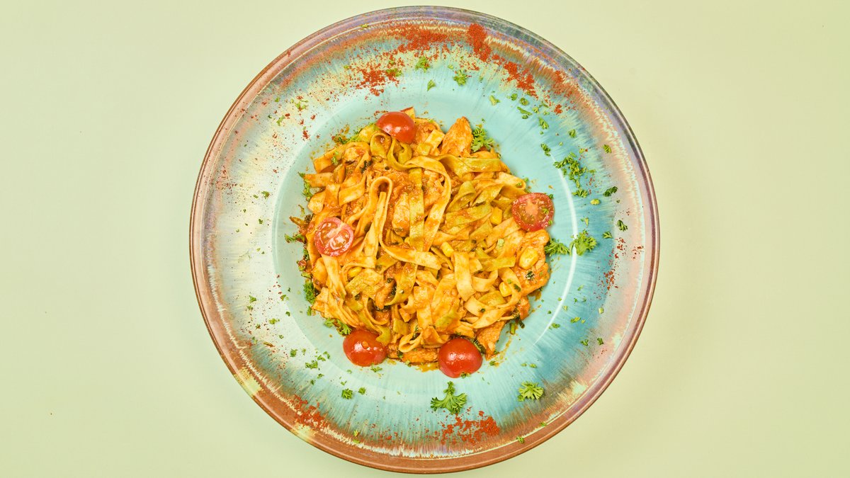 bunte Bandnudeln mit Putenbrustfiletstreifen, Kirschtomaten, Frühlingszwiebeln, Mais und Koriandersoße nach mexikanischer Art