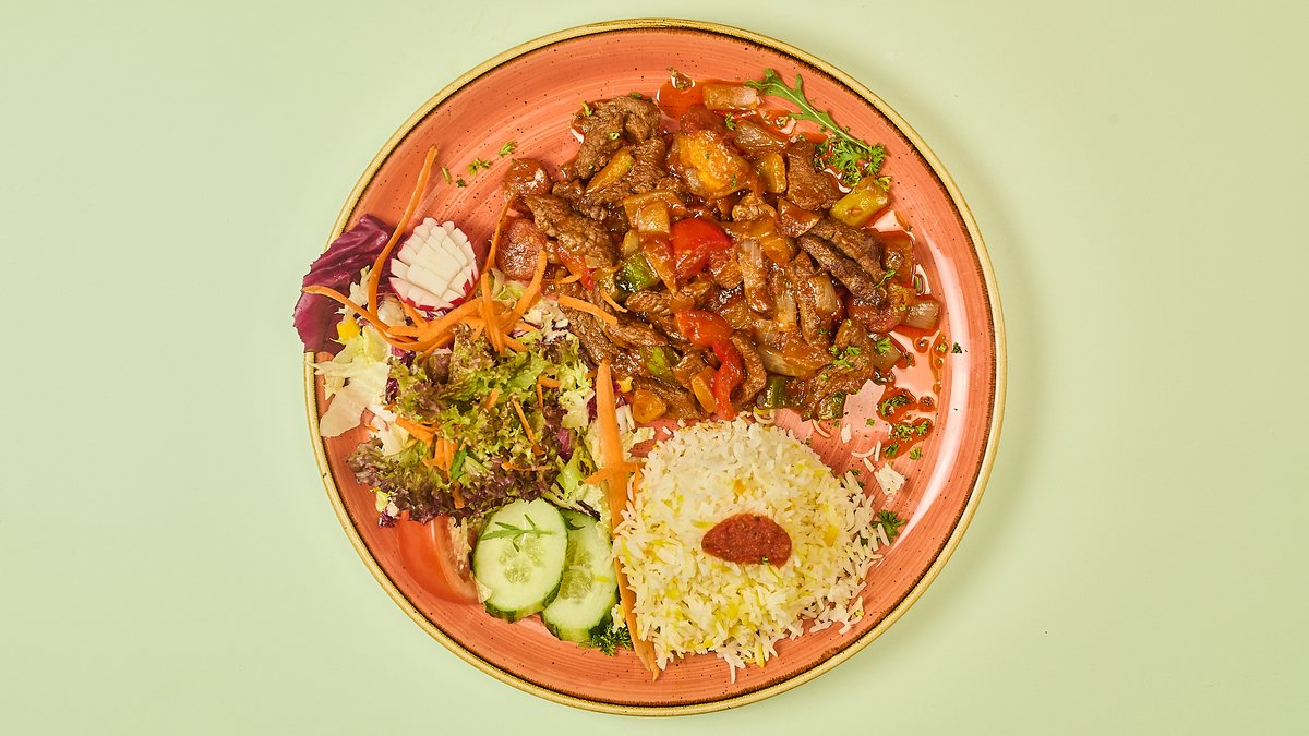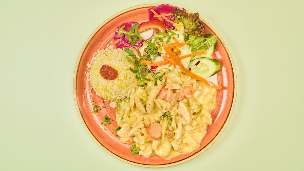 Hähnchenbrustfiletstreifen mt Ananas und Gemüse gebraten, dazu exotische Süß-Sauer-Soße, Reis und Salat