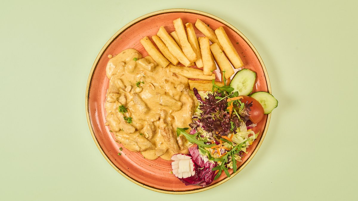 gebratene Schweinefiletstreifen in Erdnuss-Sahnesoße mit frittiertem Maniok und Salat
