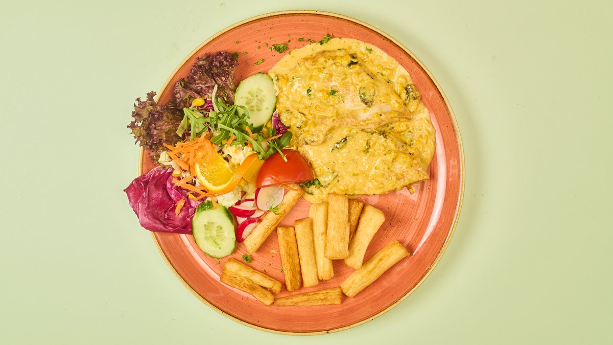 Hähnchenbrustfilet vom Lavagrill in scharfer Paprika- und Mais-Sahnesoße mit frittiertem Maniok und Salat
