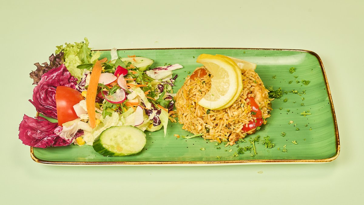 Reispfanne mit zartem Hähnchenfleisch, Gemüse und Ei