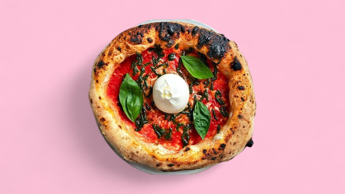 mit San Marzano Tomaten, Grana Padano, Pecorino Romano, Burrata, hausgemachtem veganem Basilikum-Pesto, Basilikum und kaltgepresstem Olivenöl
