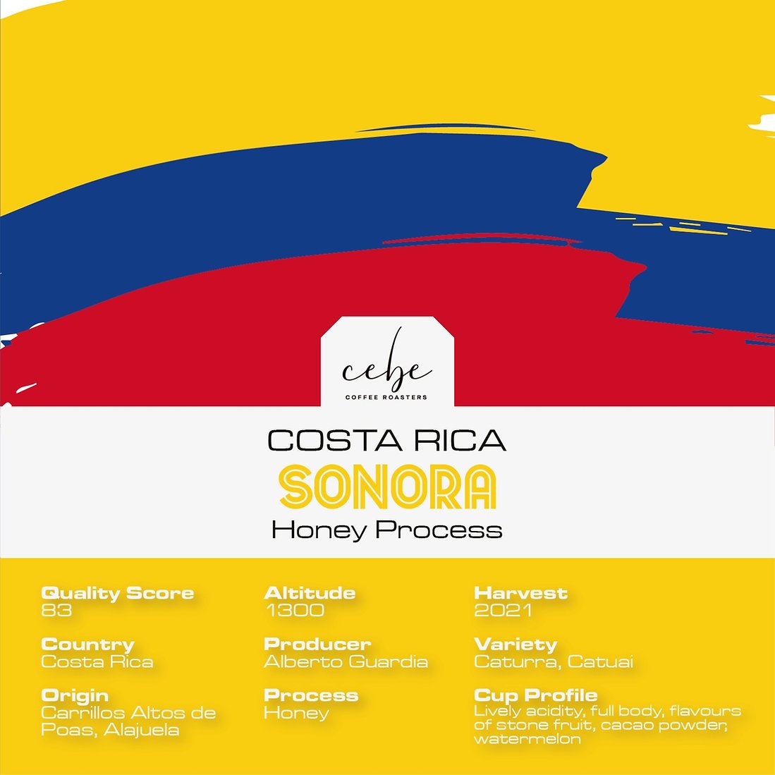 quality score - 83 / country - costa rica / origin - corrillos altos de pas, alajuela / altitude - 1300 / producer - alberto guardia / process - honey / harvest - 2024 / caturra, catucai / cup profile - lively acidity, full body, flavours of stone fruit, cacao powder, watermelon / roasted by cebe coffee roasters