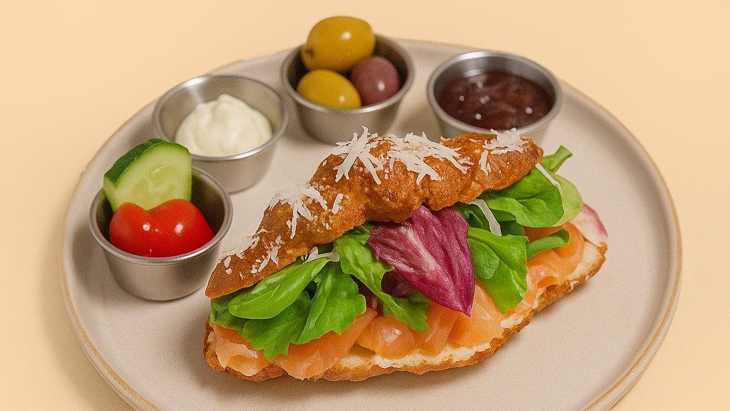 Croissant-Sandwich mit Räucherlachs, Frischkäse, Parmesan und Salat