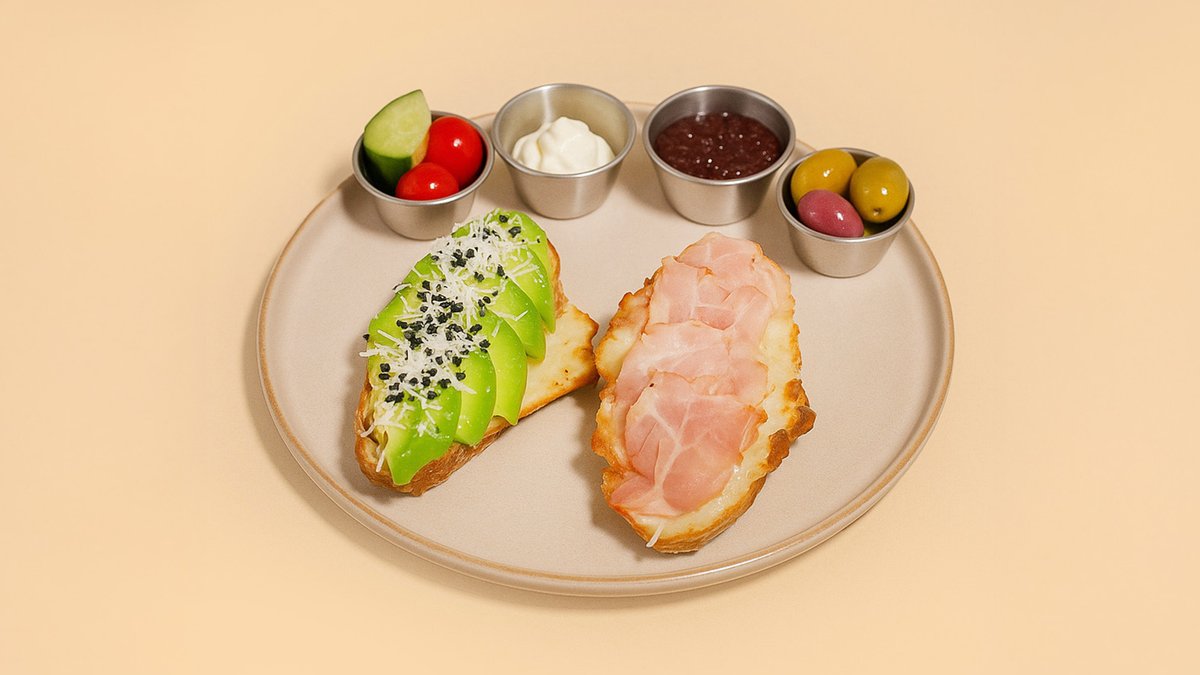 Offenes Croissant mit Käse, Avocado und Rindfleisch-Bacon