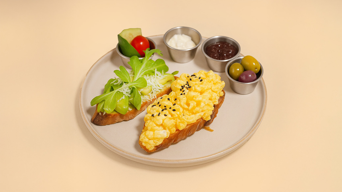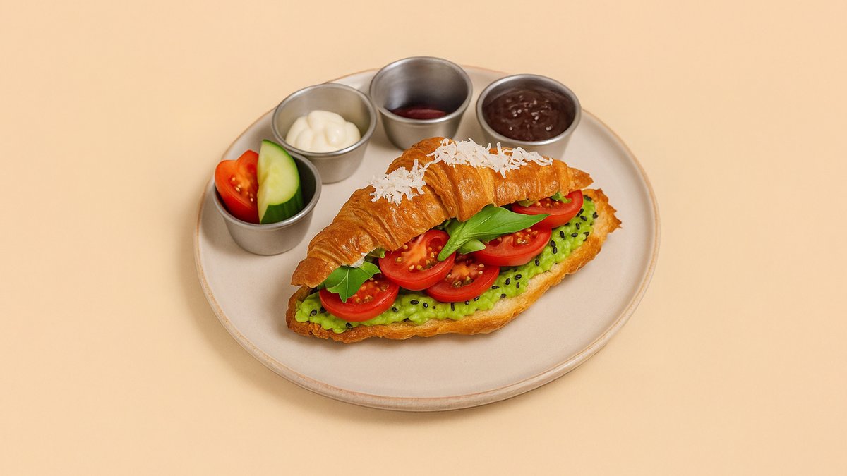 Offenes Croissant mit Käse, Rührei und Avocadocreme