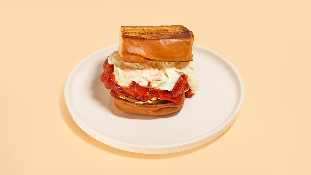 mit Mayonnaise, Essiggurke, in Nashville Hot Honey getunkt, und Krautsalat