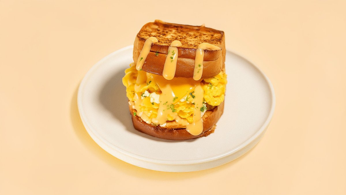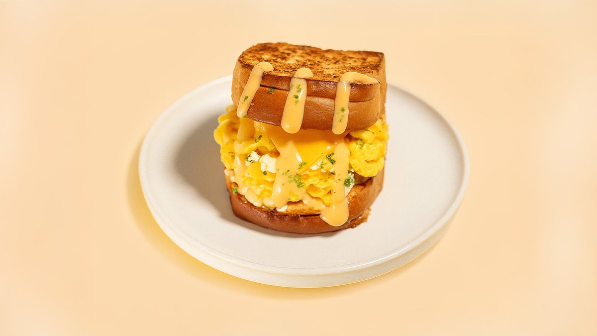 mit Rührei, Cheddar, Feta, Dill, Knoblauch, hausgemachter Soße und Brioche-Brötchen