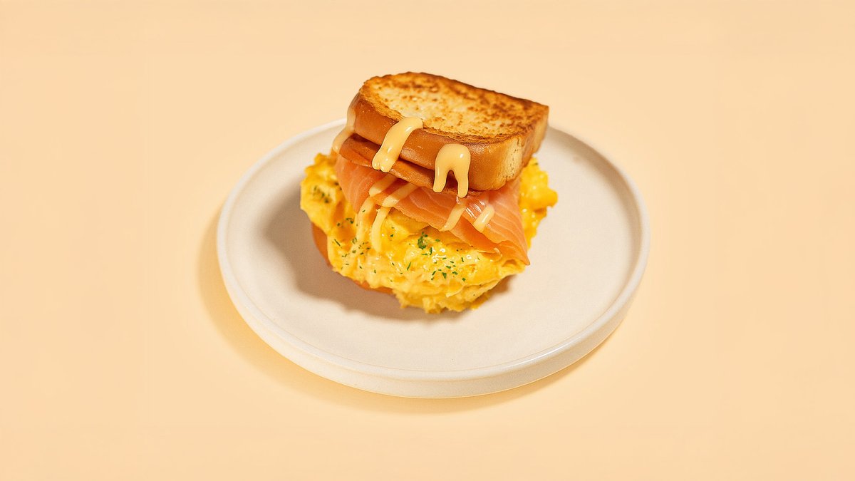 mit Rührei, Cheddar, Räucherlachs, Avocado, hausgemachter Soße und Brioche-Brötchen