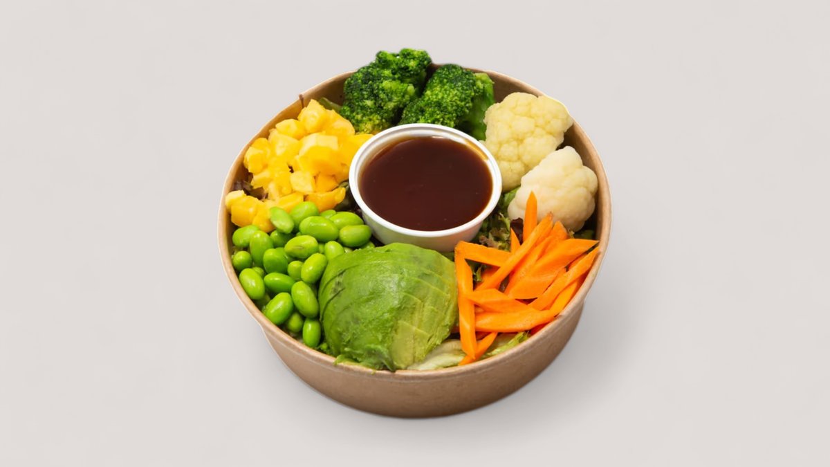 Salat, Mango, Brokkoli, Edamame, Rotkohl, Karotten, Hummus und Frische Avocado