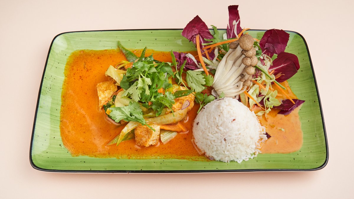 Hausgemachte Mango Curry Creme mit Vegan Ente und Saison Gemüse dazu frischem Salat und Jasminreis