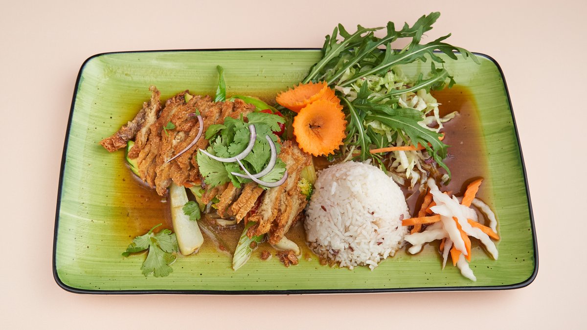 Erdnusscreme mit Vegan Duck ,Saison Gemüse und frischem Salat serviert mit Jasminreis.