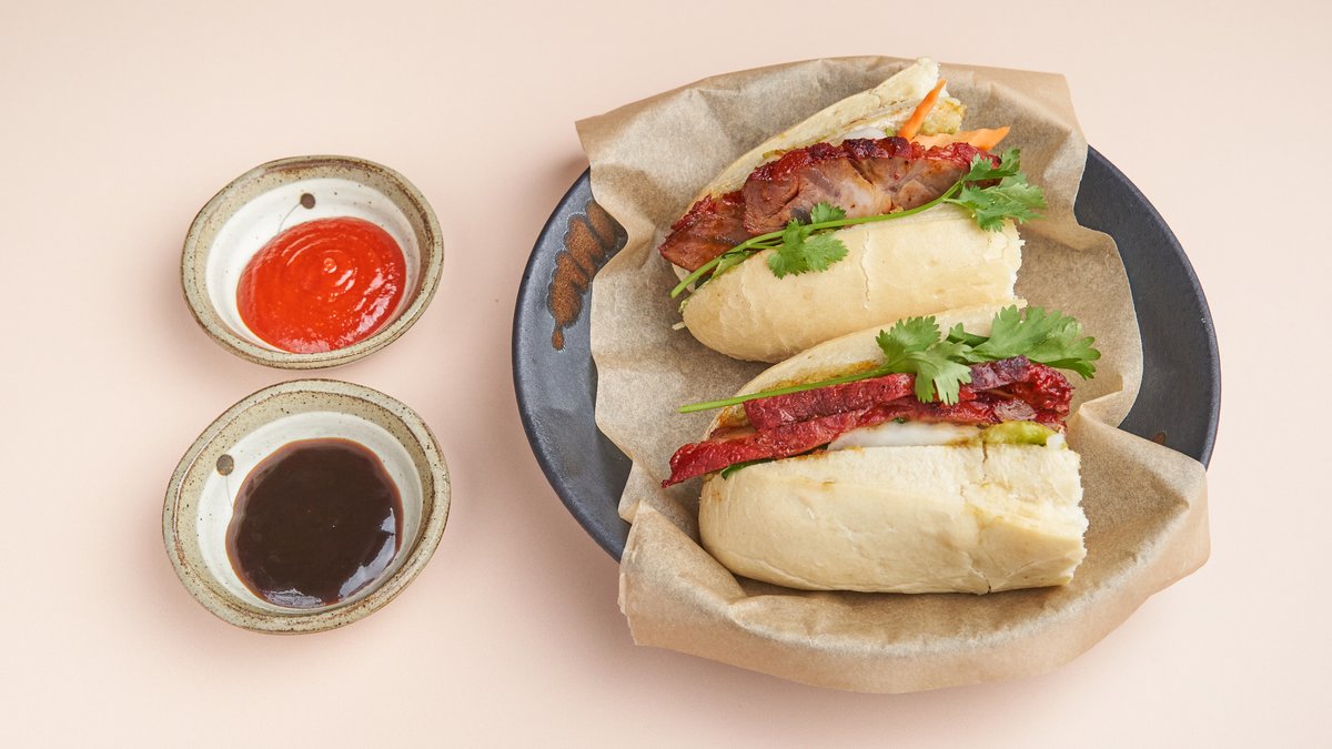 Vietnamesisches Baguette mit knusprigem Schweinebauch, Avocado, Gurke, eingelegtem Rettich, Koriander, Röstzwiebeln