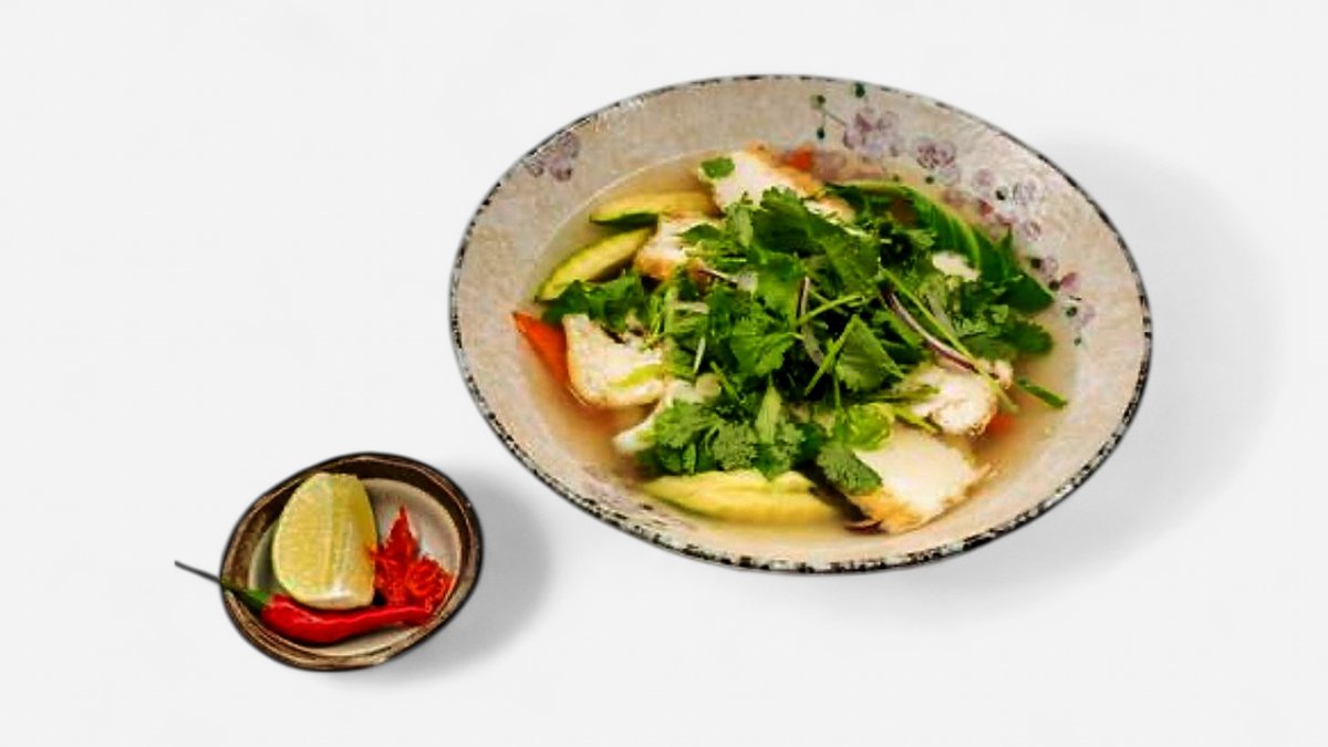 Gegrilltes Filet vom Lachs, in Stücken nach Hanoier Art, Kurkuma, Dill, Reisnudeln, Fisch-Limetten-Dressing