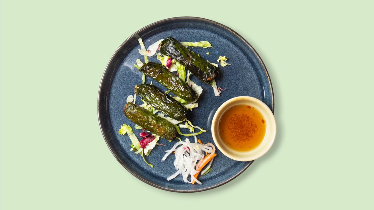 mit gegrillten Pfefferblatt-Rollen, Bio-Tofu-Füllung, Austernpilzen, eingelegtem Rettich und Soja-Limetten-Dressing