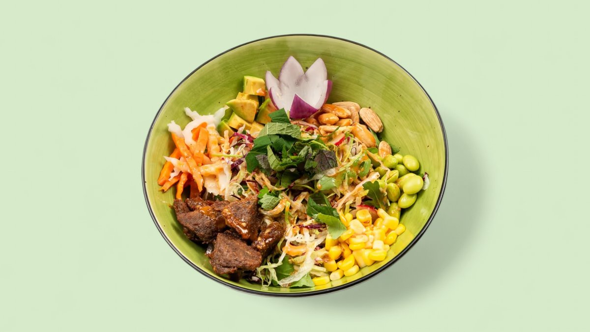 mit süß-sauer gebratenem Bio-Tofu, Edamame, Goldmais, Kaschunüssen, Sesam-Dressing und Jasminreis