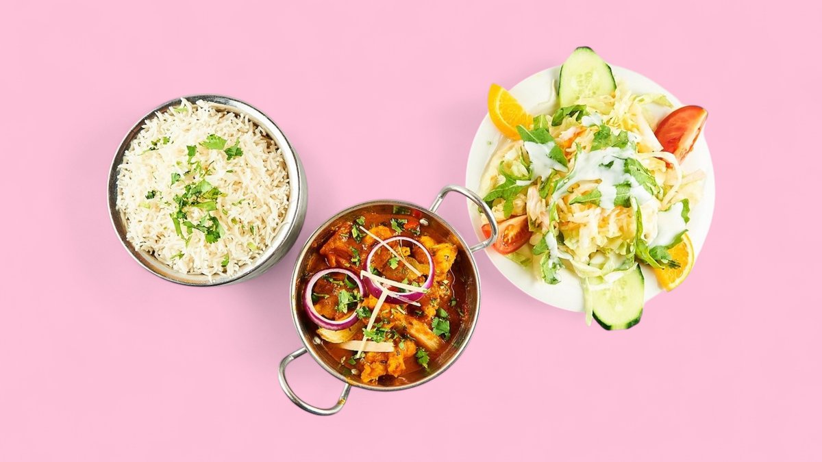 alle Platten werden mit pakistanischem Basmatireis, Salat und Brot serviert