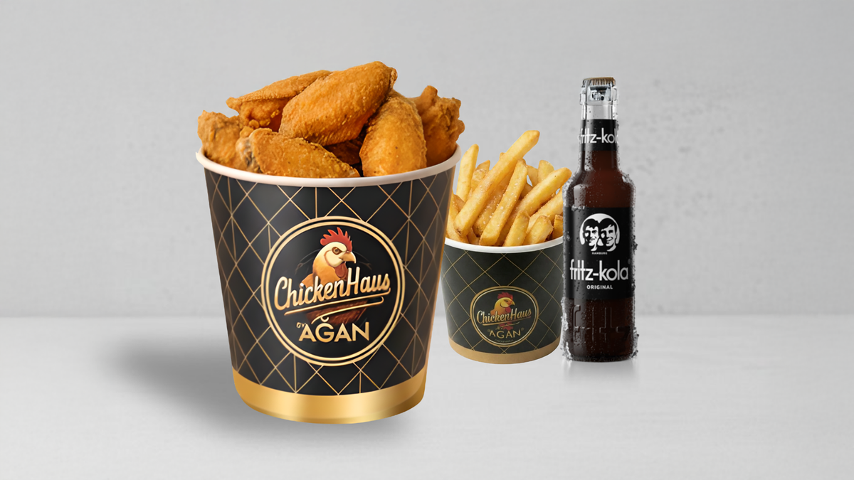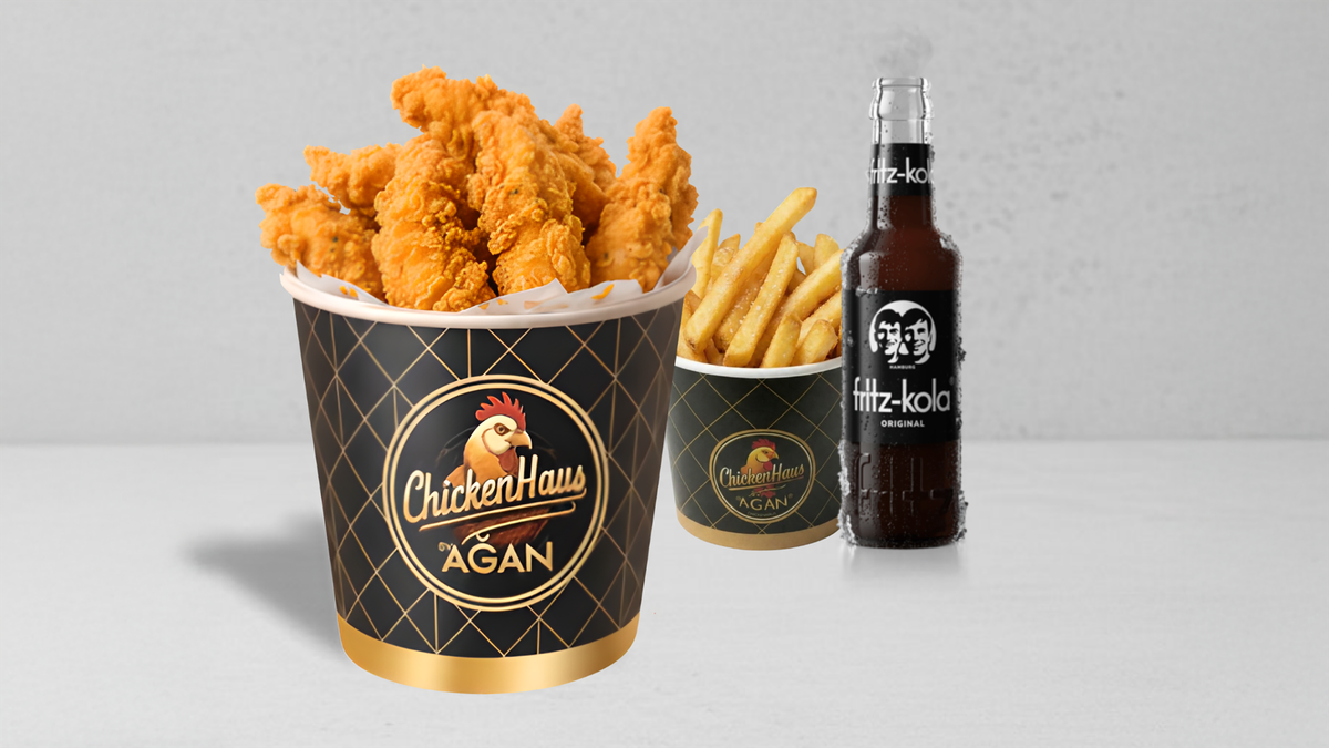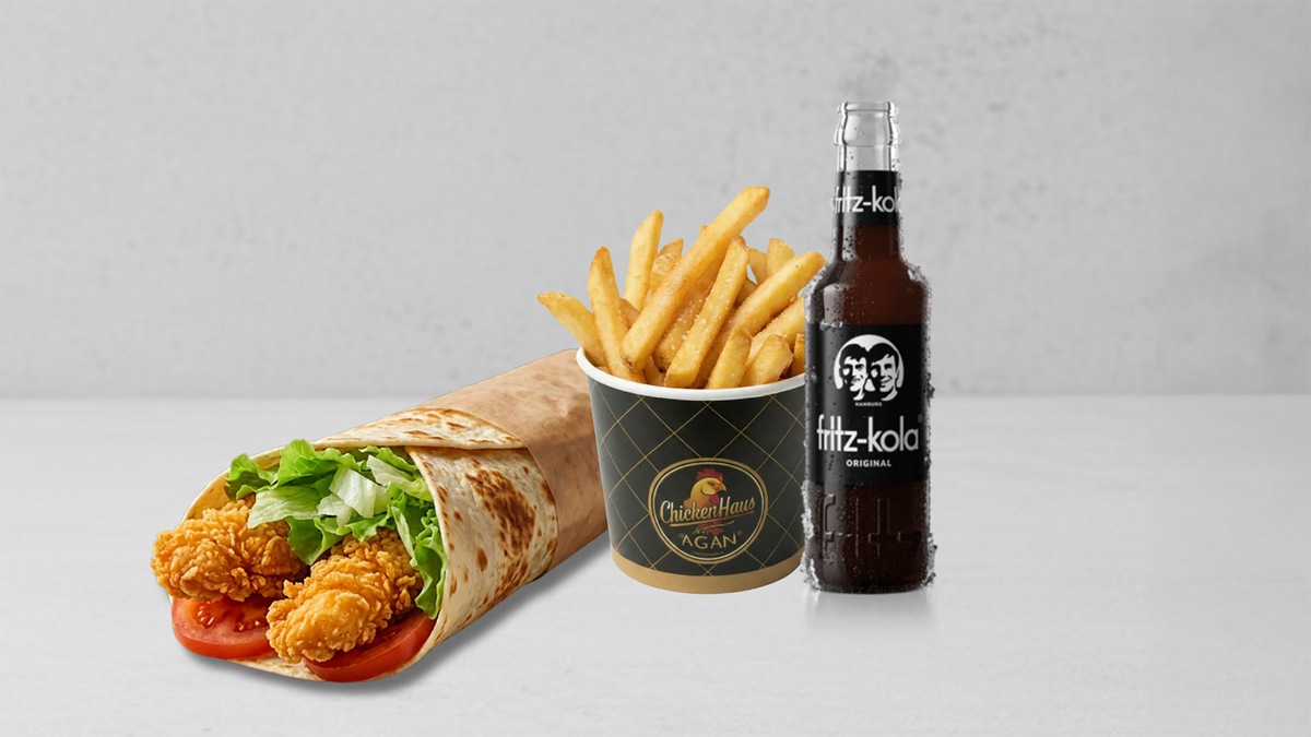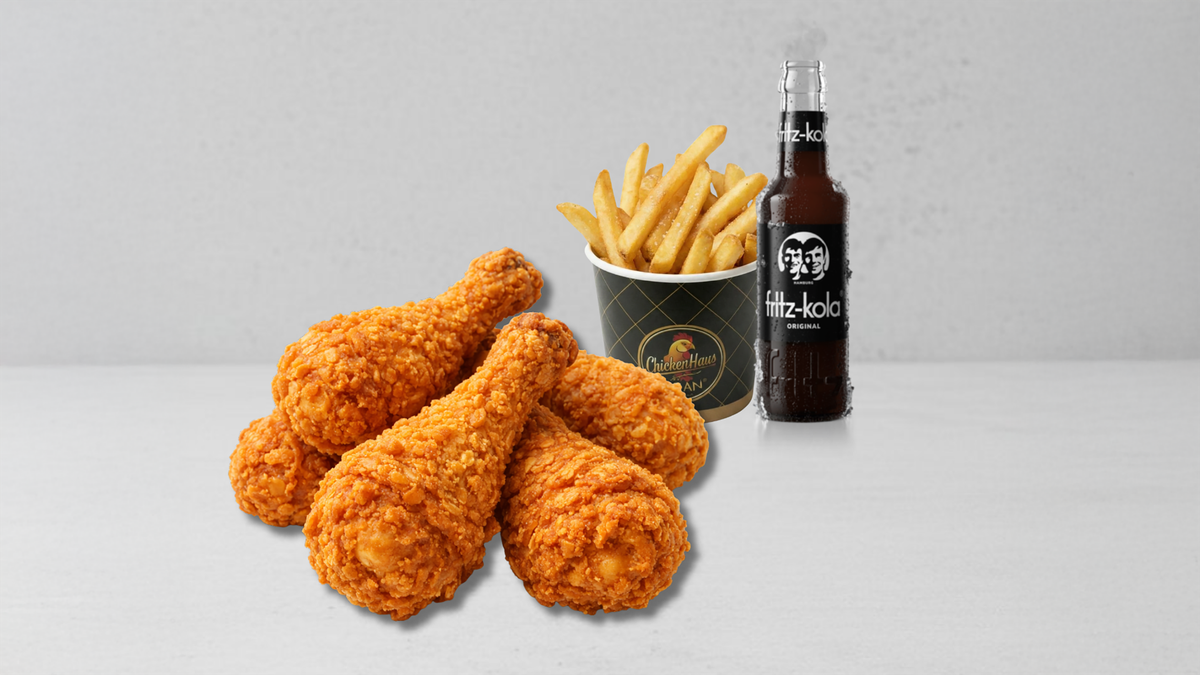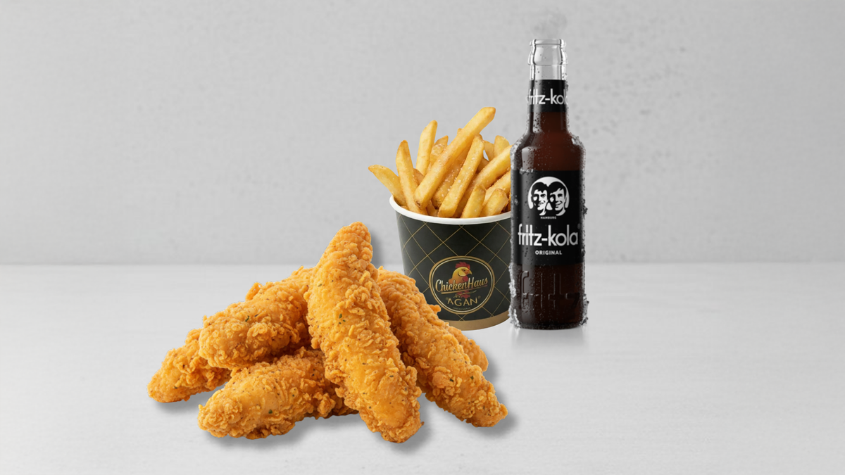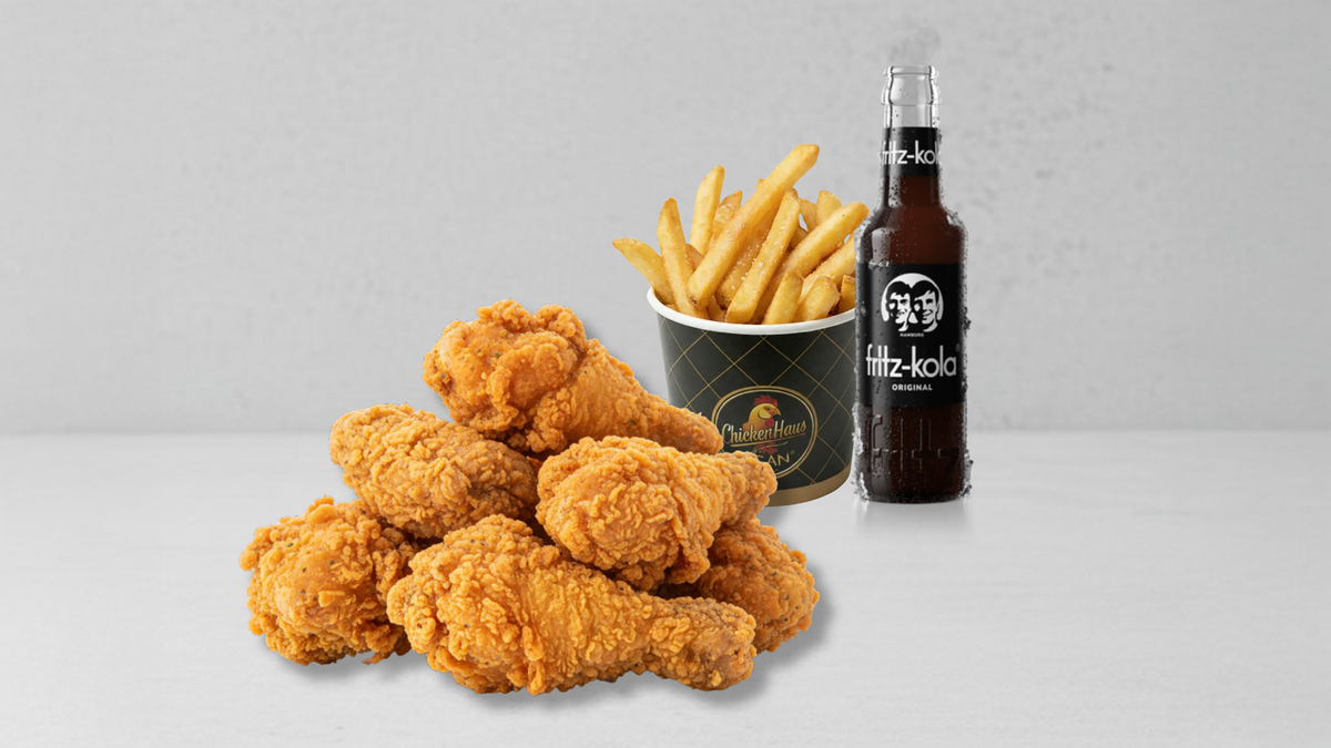 2 Tender, 4 Wings, 1 Unterkeule mit Pommes oder Reis 3 Soßen und 1 Getränk