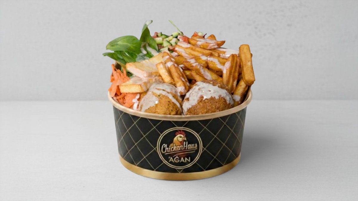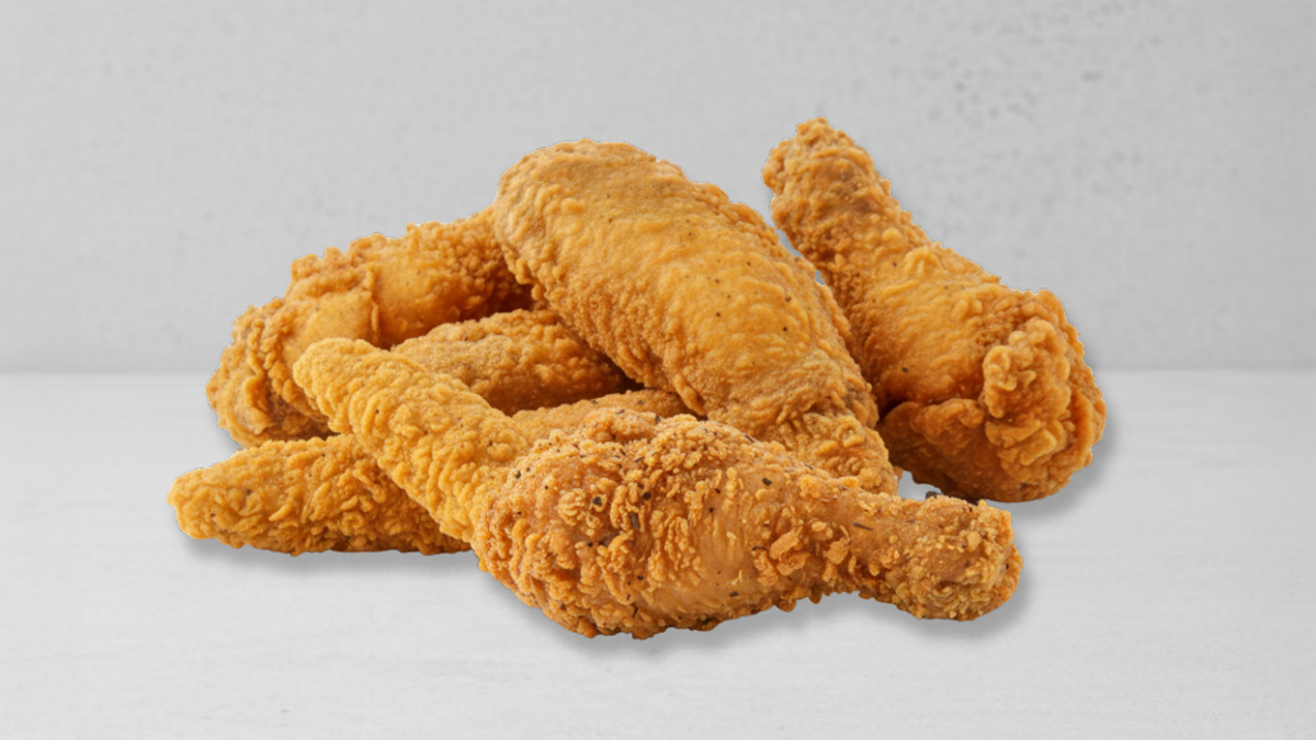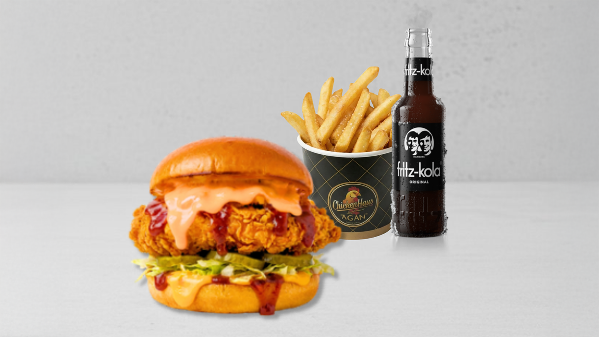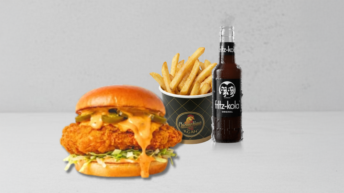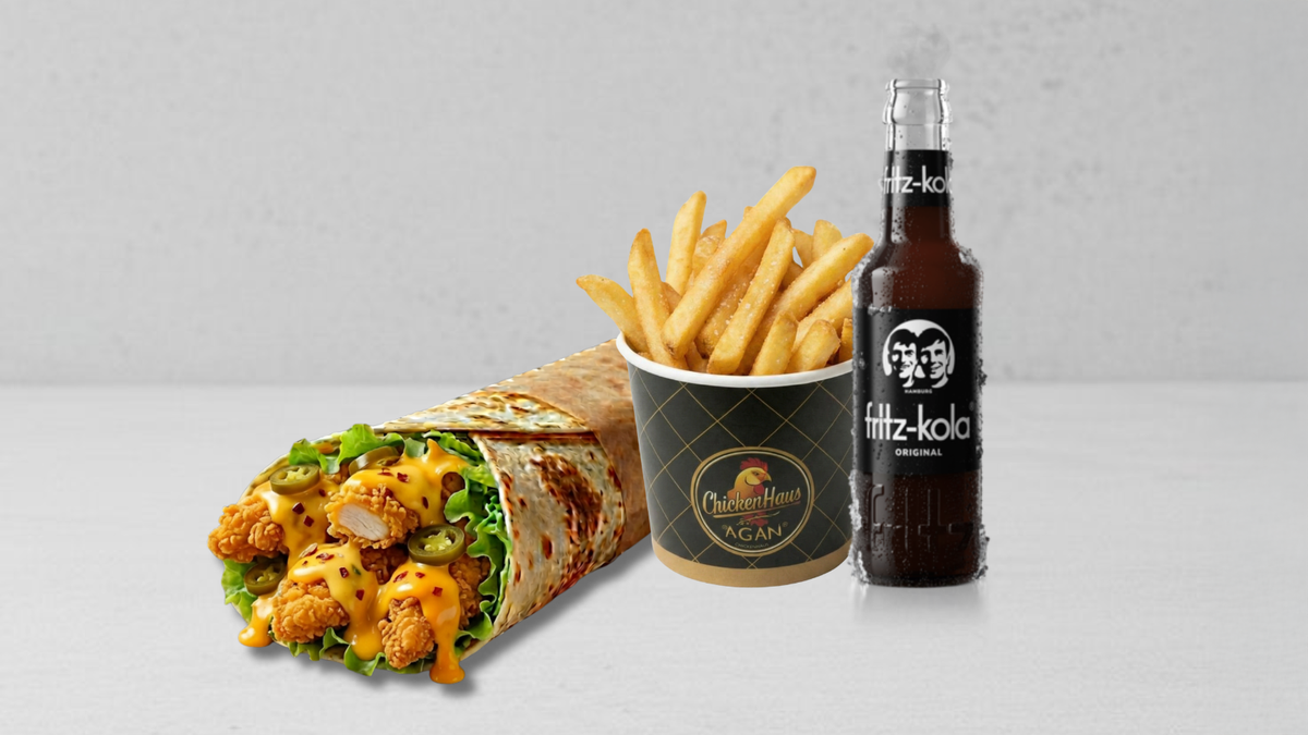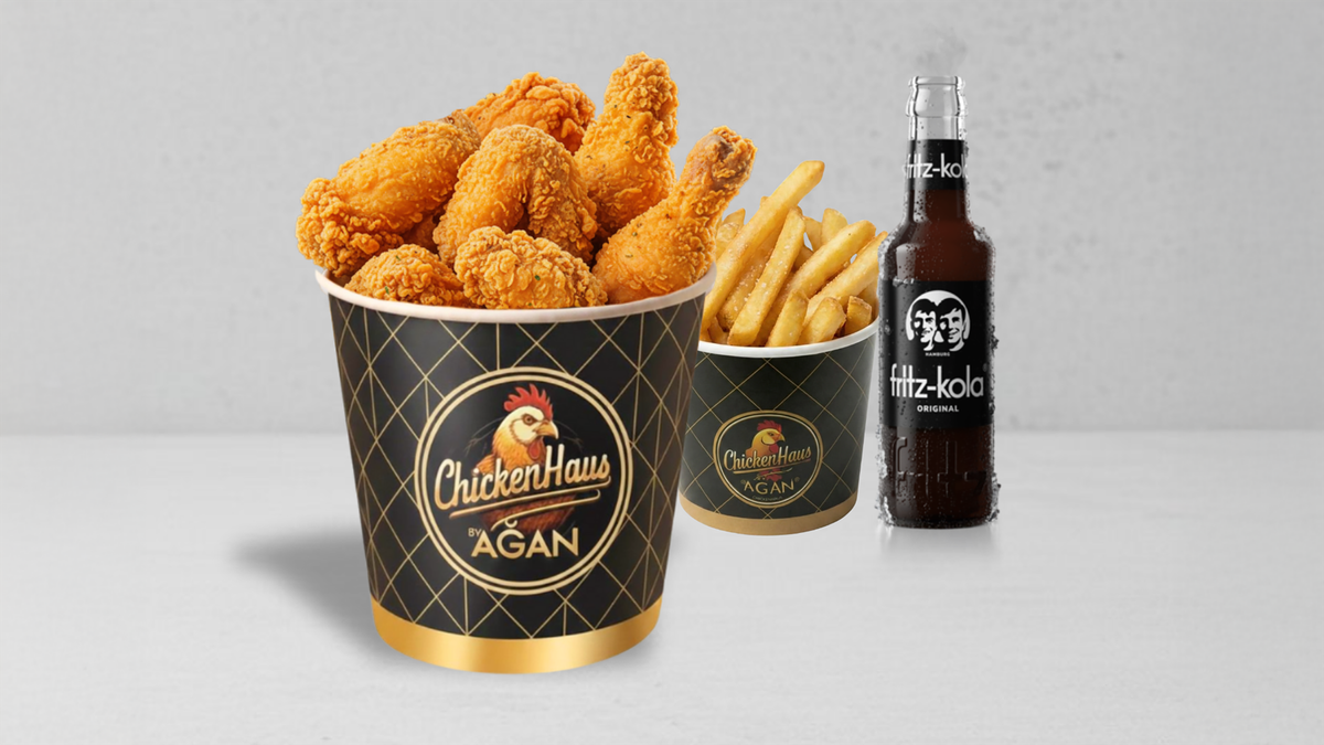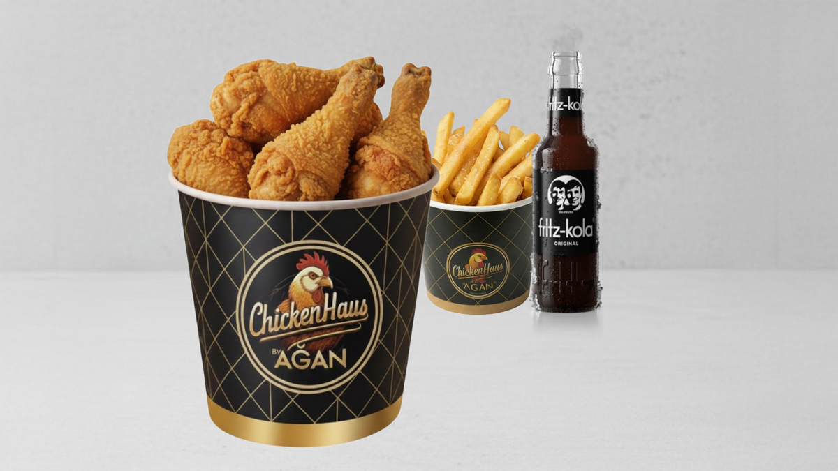 2 Tender, 4 Wings, 1 Unterkeule mit Pommes oder Reis 3 Soßen und 1 Getränk