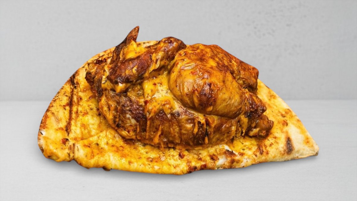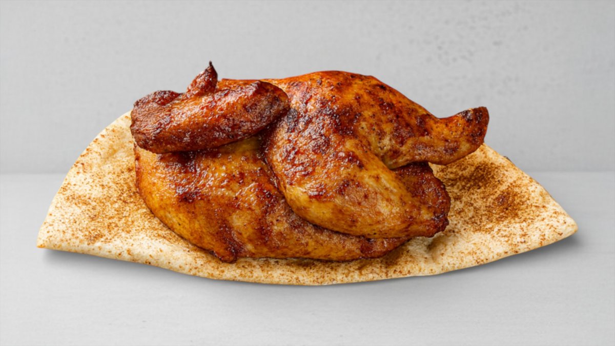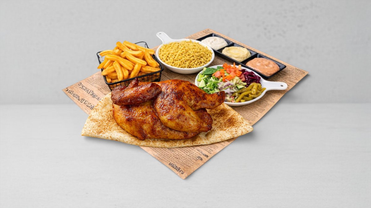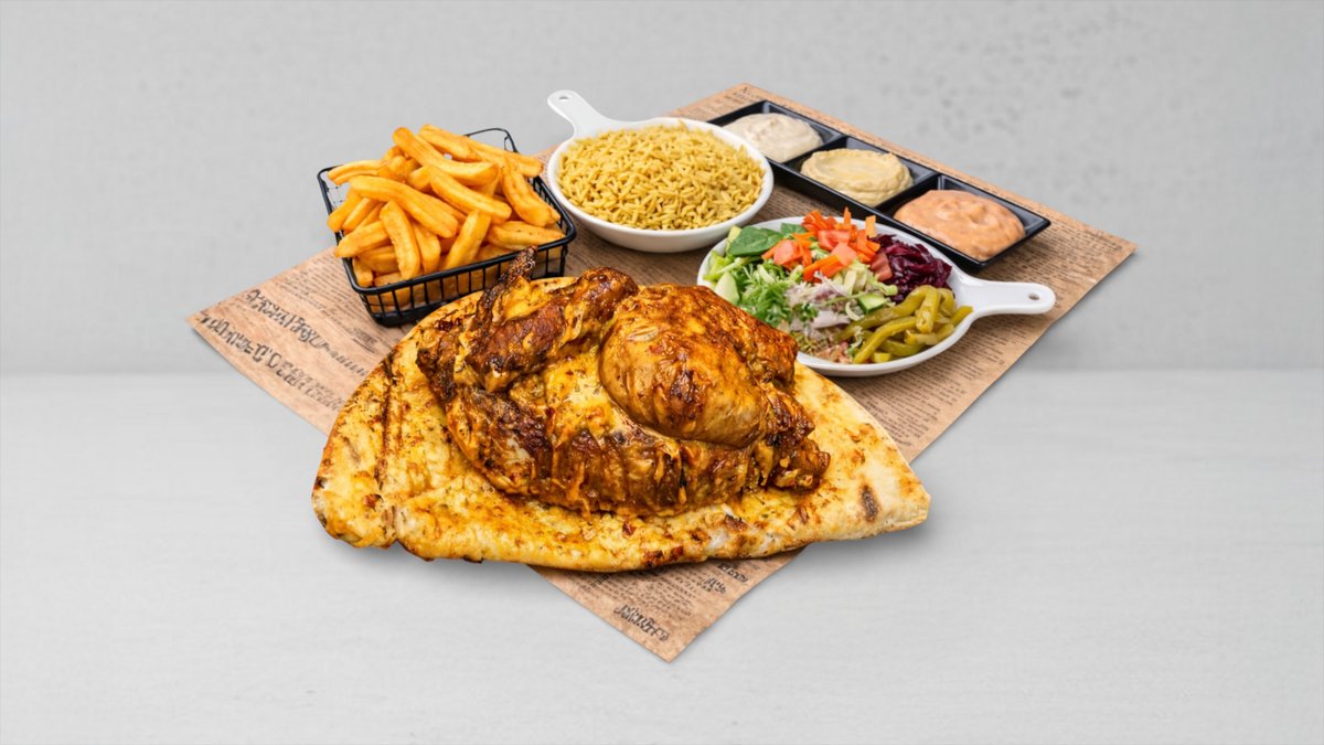 halbes gegrilltes Hähnchen in Spezial-Marinade mit gemischtem Salat, Hummus, Knoblauch und einer Beilage deiner Wahl